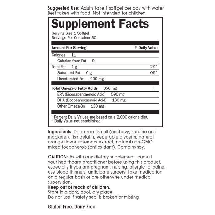 Омега-3 рибено масло съдържа висока концентрация на Омега-3 мастни киселини - 850 мг (включително 590 мг EPA и 130 мг DHA) - което означава повече Омега-3, за да поддържа сърдечното здраве и по-малко наситени мазнини, които трябва да избягвате.